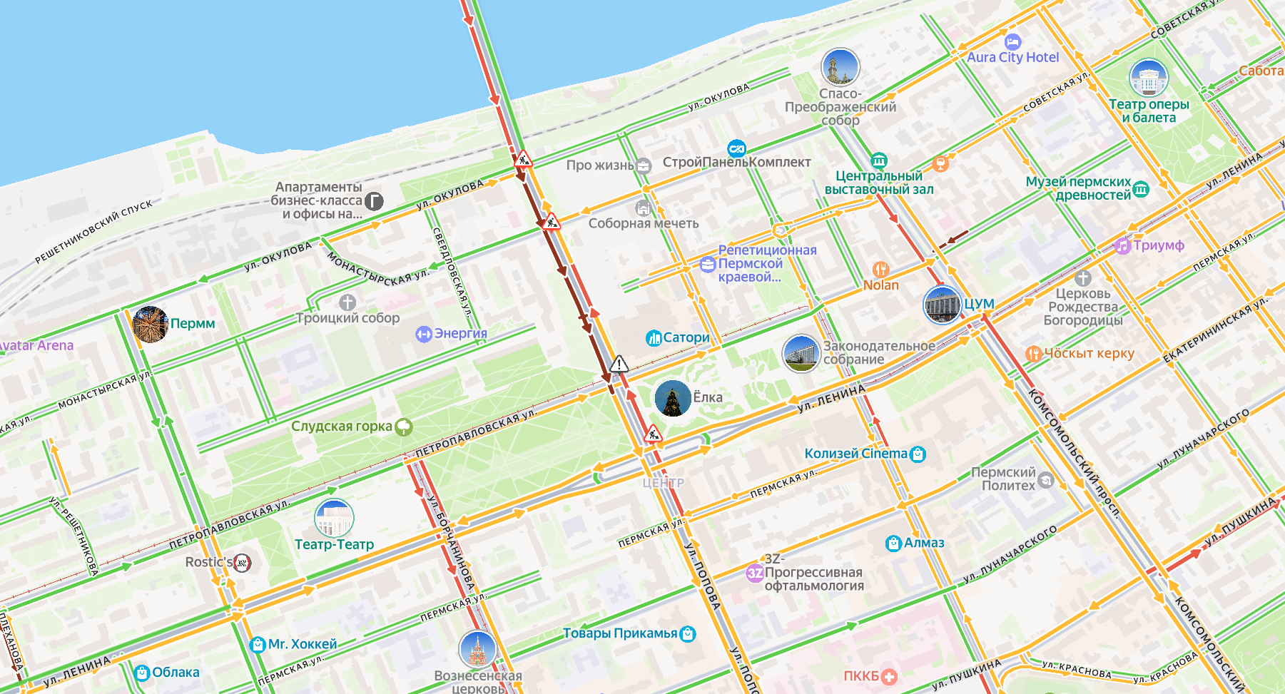 В 20:00 сервис «Яндекс Карты» оценил уровень загруженности пермских дорог в пять баллов из десяти. Пользователи указали, что пробки вызваны неразберихой из-за неработающего светофора на перекрёстке.