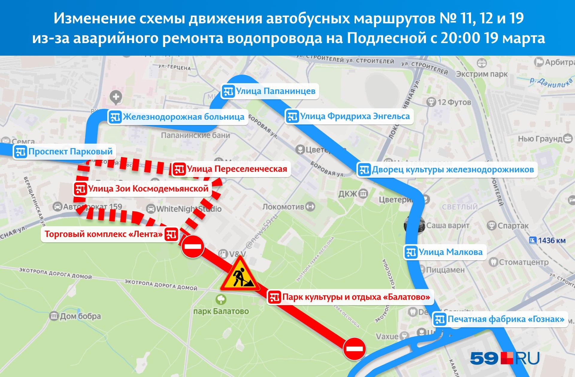 Автобусы маршрутов № 11, 12 и 19 будут следовать в объезд через ДКЖ. По пути они не остановятся на «Улице Зои Космодемьянской», «Улице Переселенческой» и у «Торгового комплекса Лента».